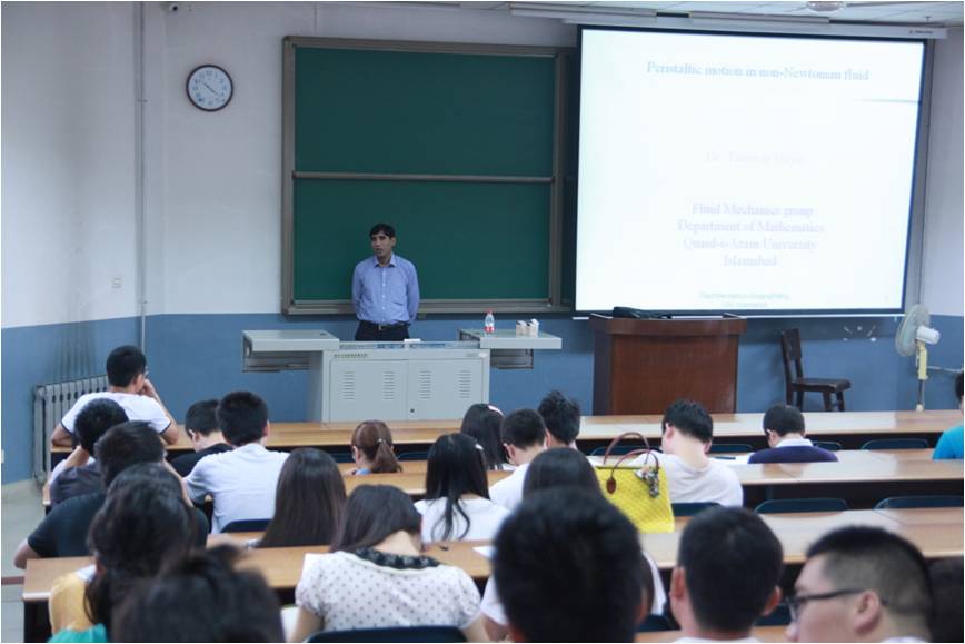 9月5日上午, Hayat教授在北校区阶梯教室J-508为公司师生做了题为“Peristaltic Motion of a Magnetohydrodynamic Generalized Second-Order Fluid in an Asymmetric Channel”的精彩报告,太阳集团tyc9728150余名师生参加了报告会。