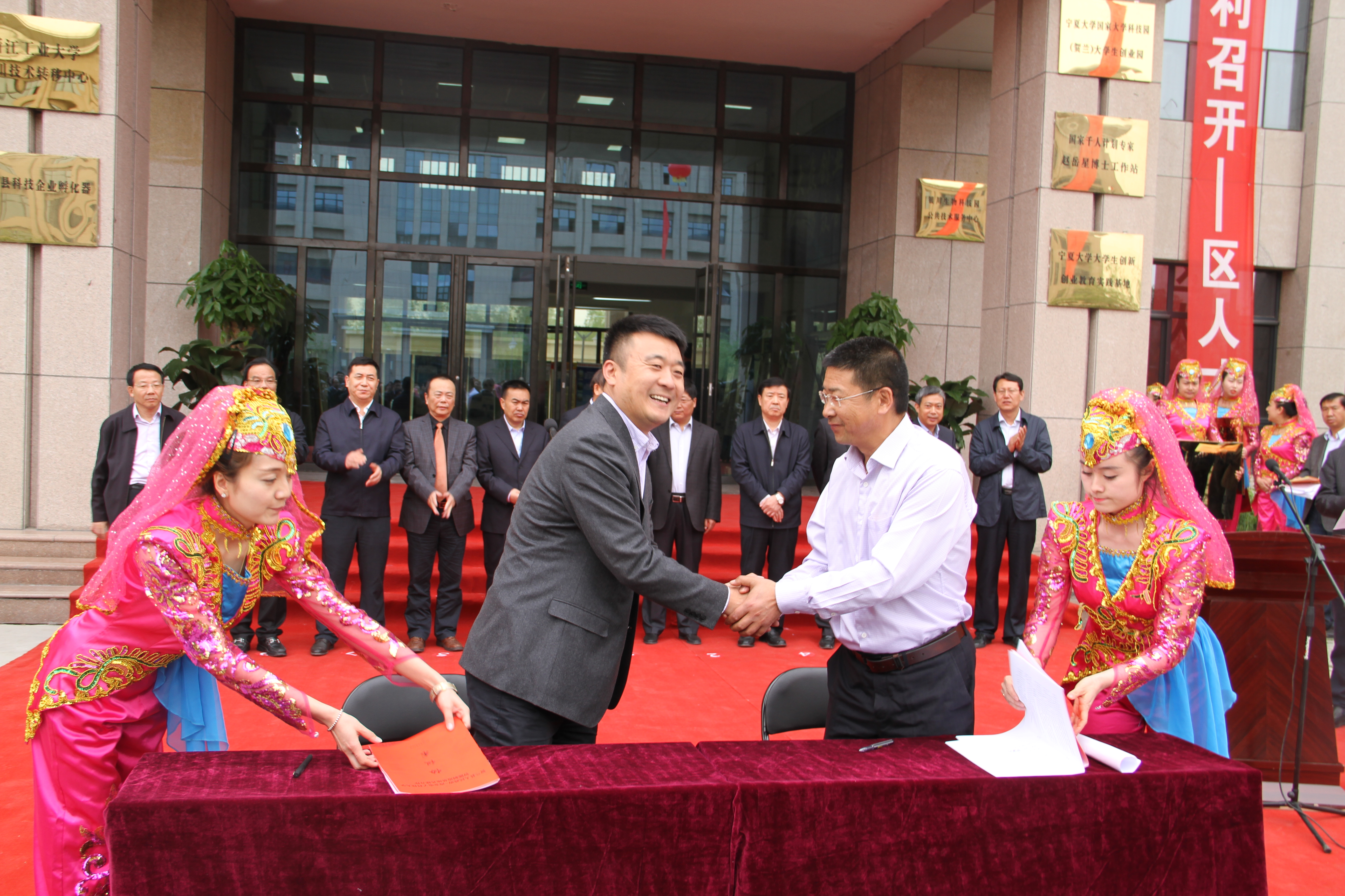 陈波副书记代表太阳集团tyc9728与银川市贺兰县签订了智能制造基地共建合作协议,史琳副经理代表公司为太阳集团tyc9728银川科技成果转移中心暨太阳集团tyc9728银川智能制造基地授牌。
