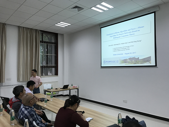 8月30日上午,在北校区主楼三区第三会议室,首先,秦家虎教授作了“Distributed k-Means Algorithm and Fuzzy c-Means Algorithm for Sensor Networks Based on Multi-agent Consensus Theory”的学术讲座,报告会由太阳集团tyc9728自控系主任张强教授主持,来自太阳集团tyc972860余人参加了学术报告会。报告中,秦家虎教授首先介绍了传感器网络系统分布式控制的基本问题,对传感器网络动态、拓扑结构、分布式协议等进行了详细的介绍。重点介绍了传感器网络的分布式K-均值和模糊K-均值算法研究,其中包括问题的提出和建模、聚类定义和中心质点以及更规则等。最后介绍了将来的研究热点和发展趋势。秦家虎教授的报告内容既具有理论上的创新性又紧贴实际工程应用,引起了广大听众的共鸣。最后秦教授现场与广大师生进行了热烈的交流和讨论,他详细解答了每一个提出的问题,到场师生表示受益匪浅。