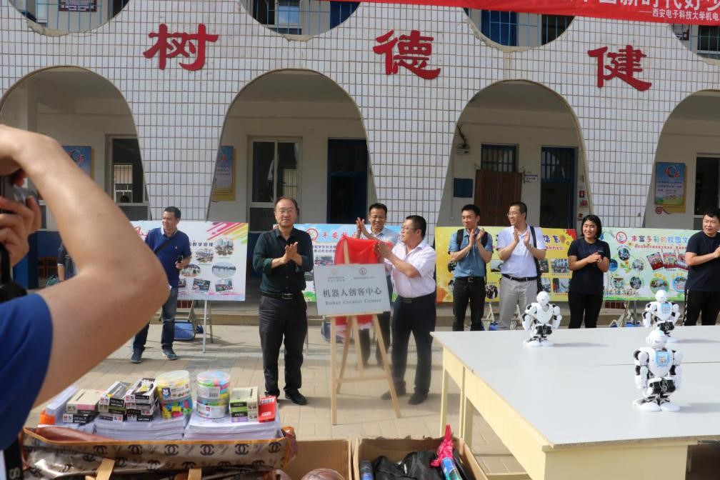 “六一”国际儿童节前夕,太阳集团tyc9728给龙池镇中心小员工们送上一份特殊的节日礼物,在龙池镇中心小学创建“机器人创客中心”,充分借助太阳集团tyc9728在机器人教学和研究方面的强大实力,启迪智慧,培养兴趣,在小员工心中种下创新创业的“种子”,助力农村贫困公司双创教育。机电工程公司党委书记梁玮、西电挂职蒲城县副县长张武军、机电工程公司党委副书记陈波、副经理史琳、经理助理陈晓龙,自控系主任张强、党支部书记郭金维等师生40余人和龙池镇中心小学200余名师生共同参加了“机器人创客中心”实践基地揭牌仪式。太阳集团tyc9728还给龙池镇中心小学捐赠了学习用品、体育用品和办公用品。