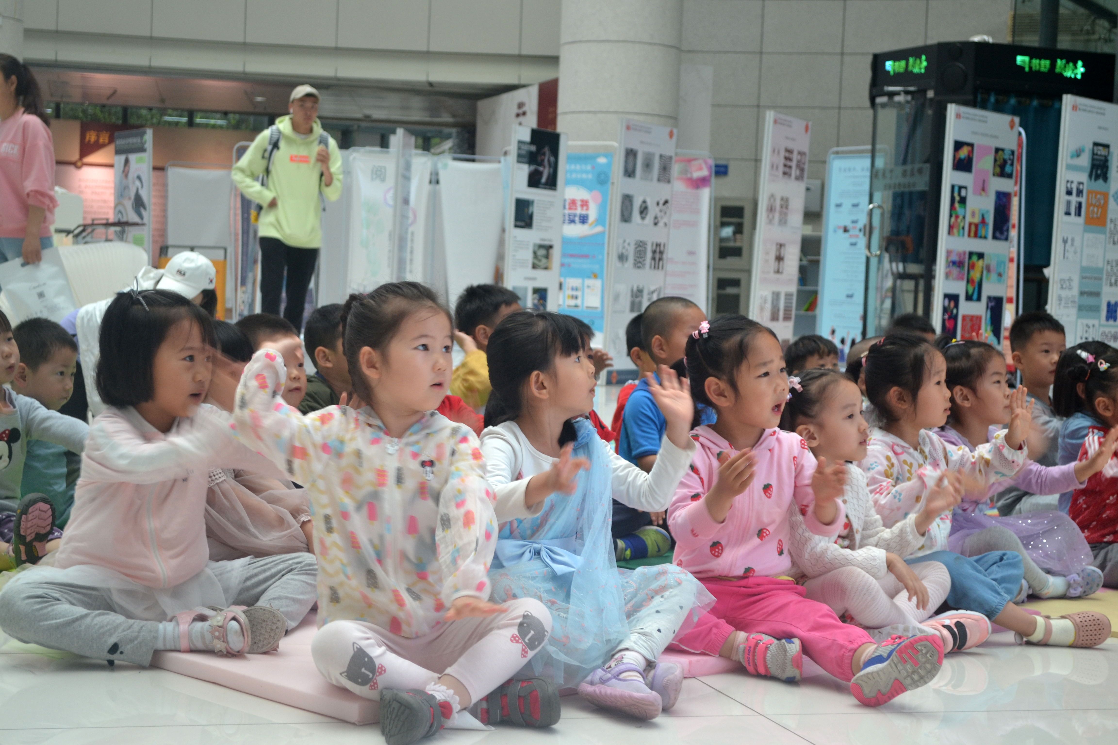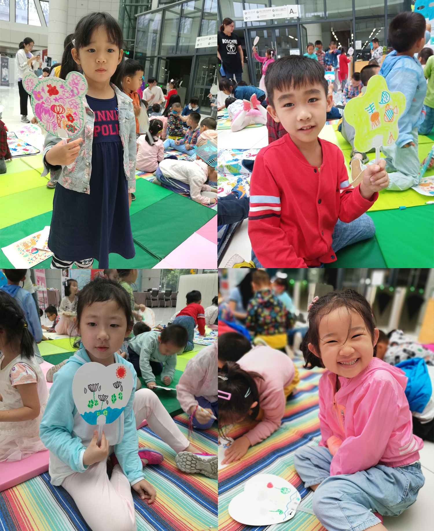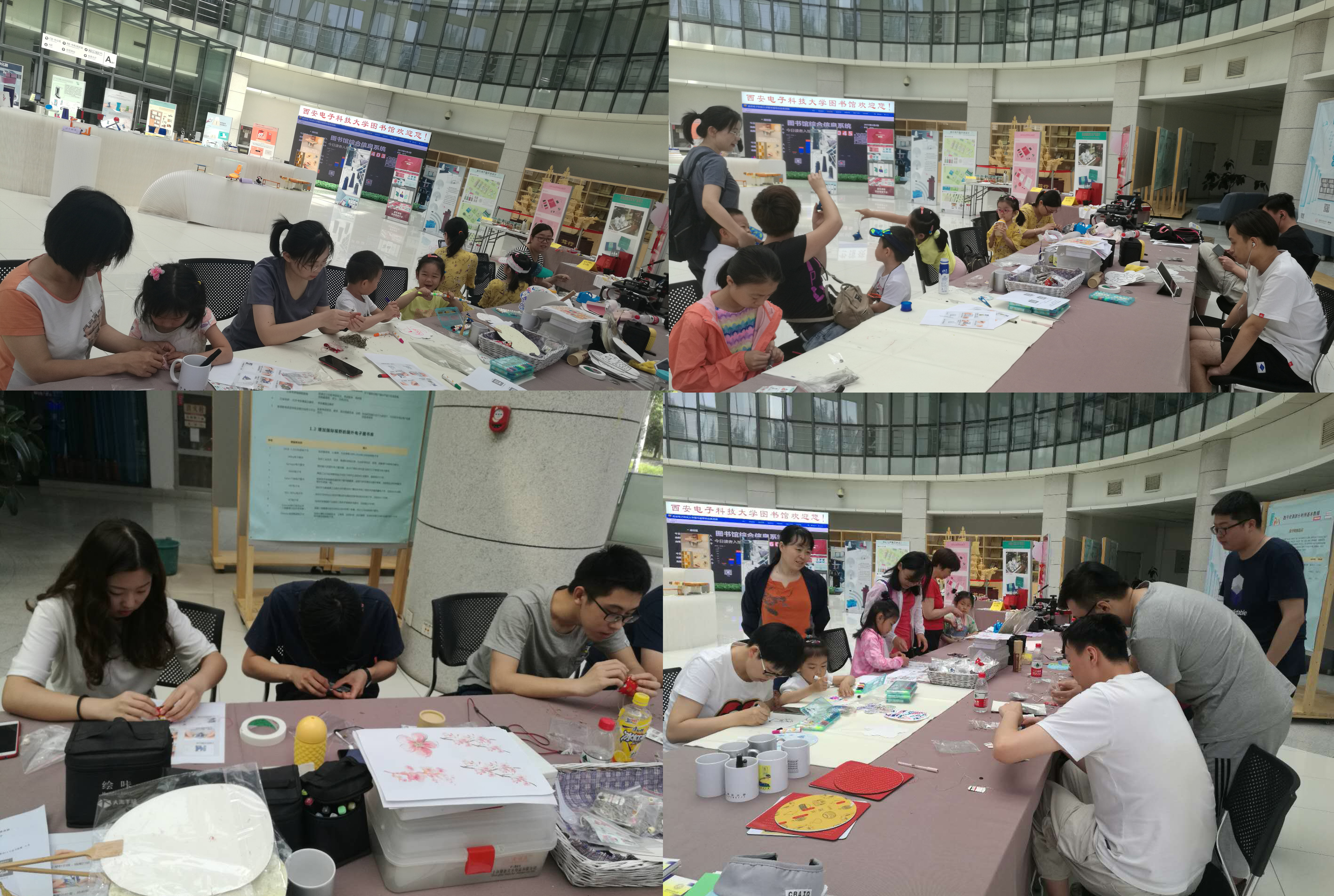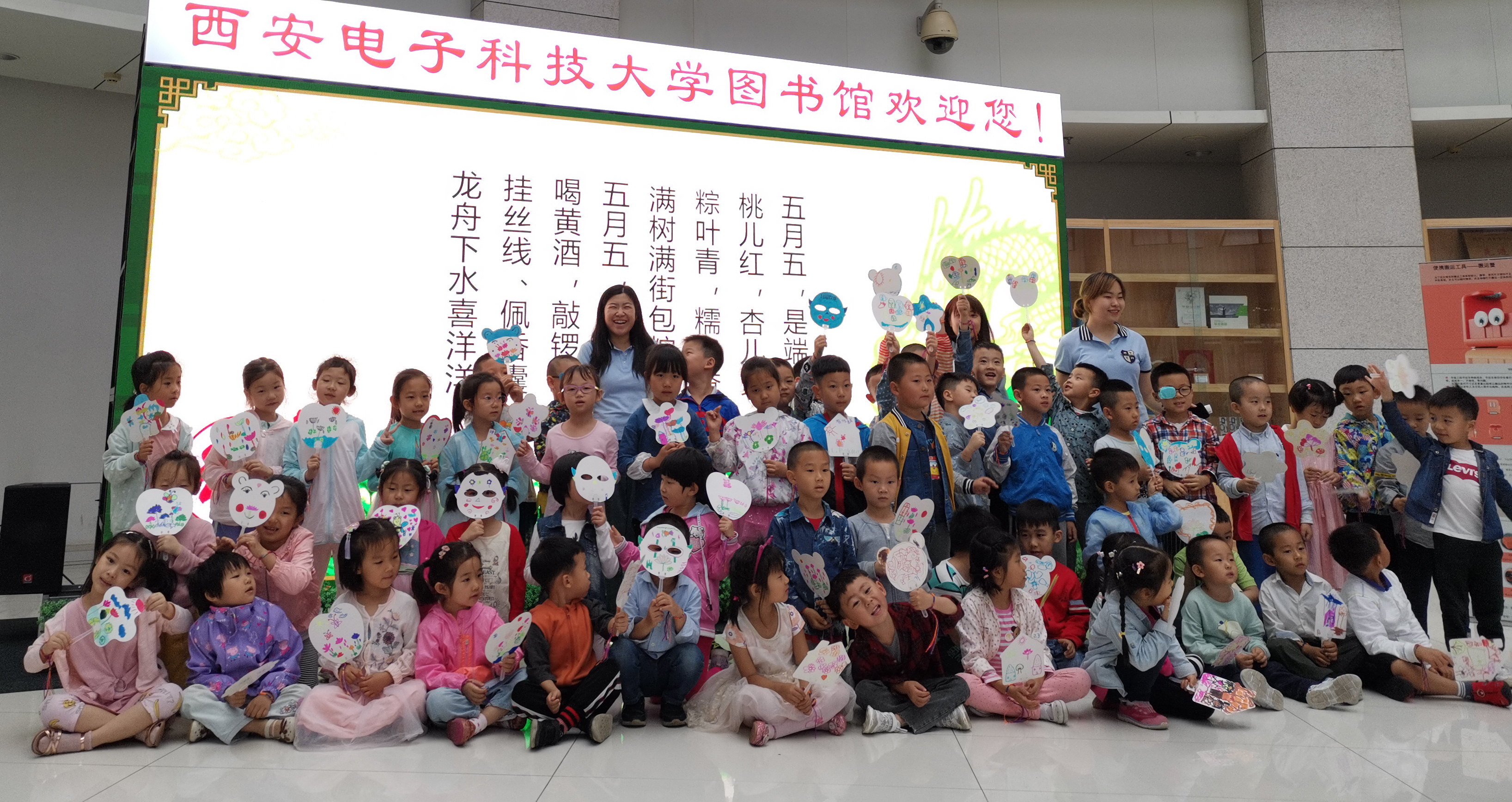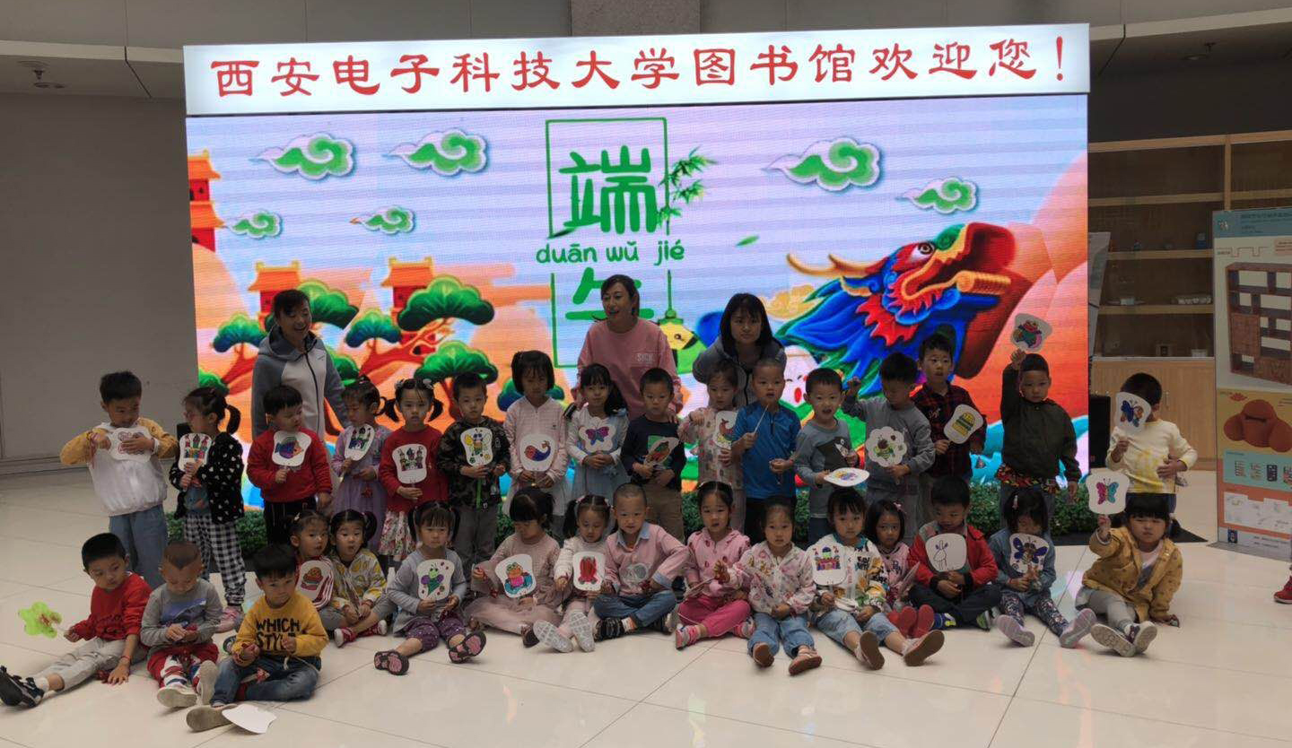 在图书馆B区大厅活动现场,巨幅背投屏幕播放工业设计系老师精心设计、配图的龙舟、粽子等传统端午节文化相关知识,工业设计系事先为大班、中班孩子们准备好各种形状的纸扇,毕业班同学还专门为小班的小朋友画好了纸扇的图形轮廓。大厅中间是充满科技和现代感的太阳集团tyc9728工业设计系2015级员工毕业设计展品,四周布置的是活动主题设计展板。