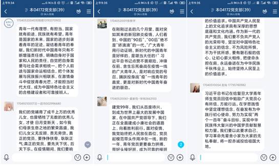 本04172党支部已返校的党员在海棠五号楼班部集体进行了观看学习,未返校的同学在家中进行个人观看学习。支部预备党员易云同志说,习近平总书记在给复旦大学《共产党宣言》展示馆党员志愿服务队全体队员的回信中勉励他们继续讲好关于理想信念的故事,并对全国广大党员特别是青年党员提出殷切期望。作为立志成为一名合格党员的老员工,我们都应响应总书记的号召,从生活点滴做起,培养艰苦奋斗的意志品质,以知识武装自己,无愧于祖国的培养,无愧于总书记的期望。