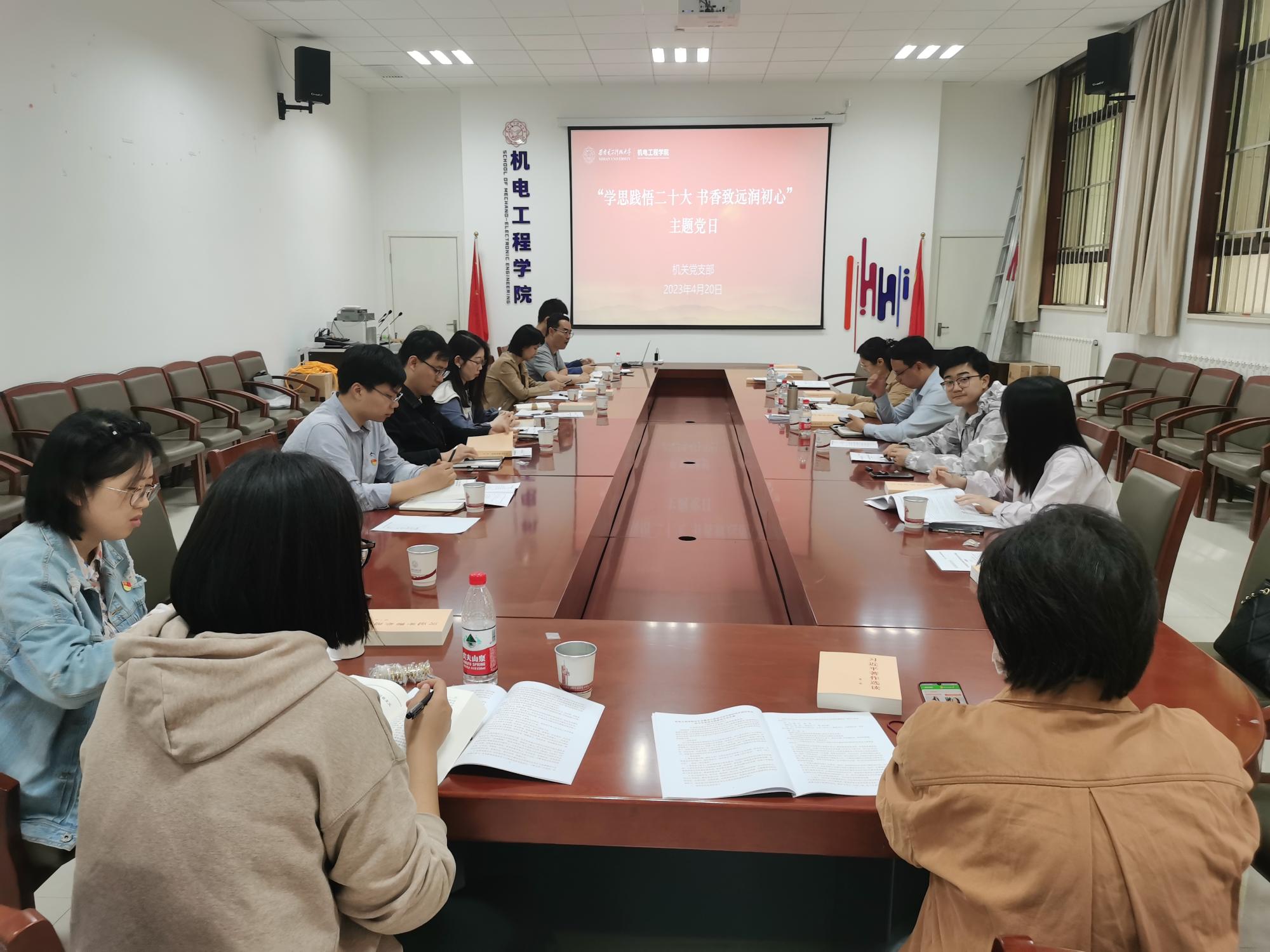 (通讯员 胡荻 卢琳)为深入学习领会习近平总书记在学习贯彻习近平新时代中国特色社会主义思想主题教育工作会议上的重要讲话精神,在第28个世界读书日来临之际,太阳集团tyc9728机关党支部“学思践悟新思想书香致远润初心”主题党日在北校区主楼召开。主题党日由党支部书记卢琳主持。
