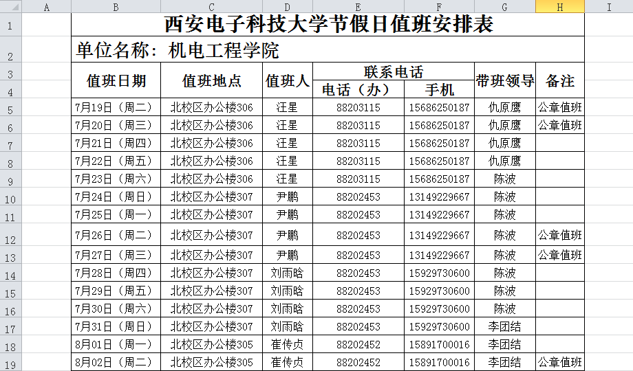 2016年暑假值班表