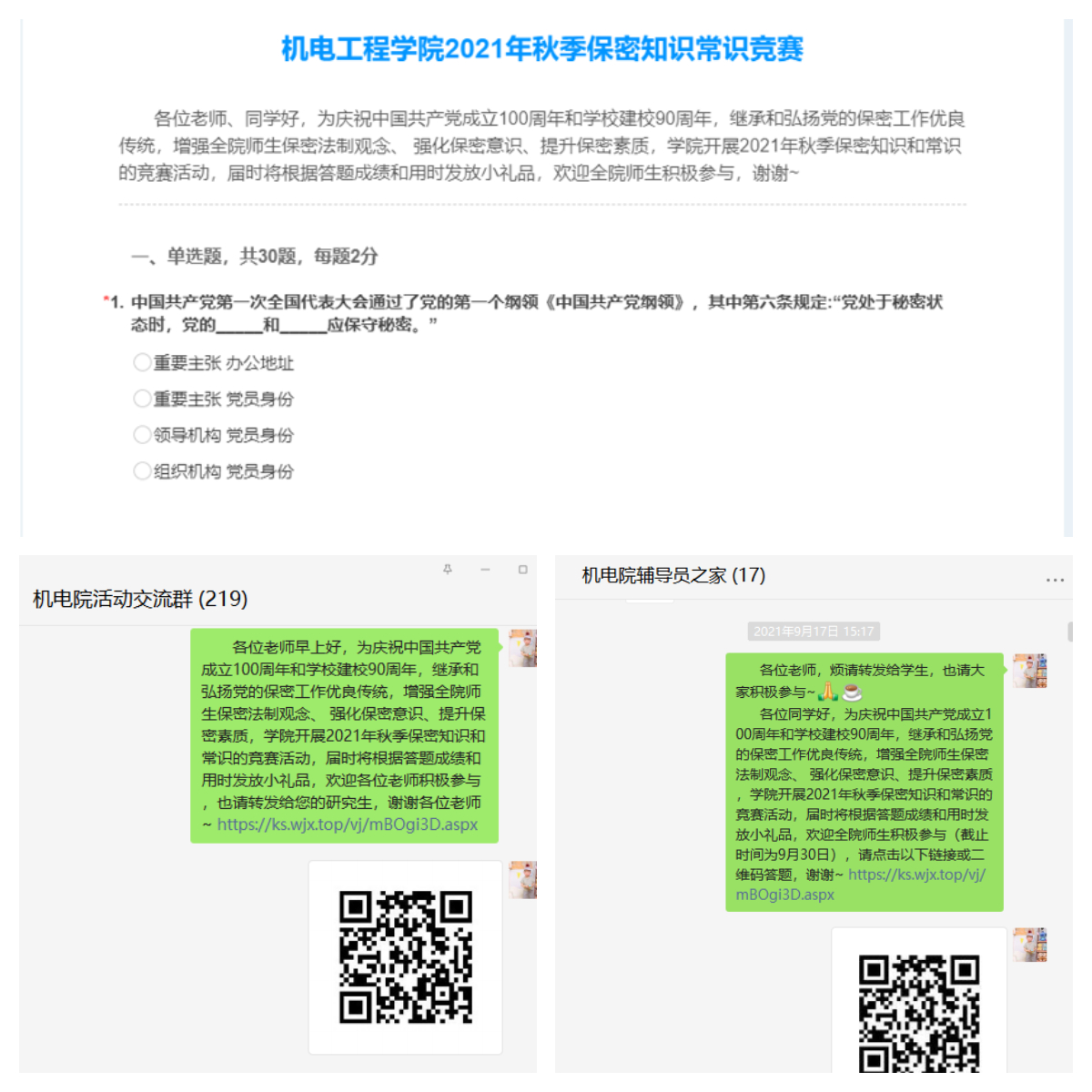 (通讯员:石贵利)为庆祝中国共产党成立100周年和公司建校90周年,继承和弘扬党的保密工作优良传统,同时激发全院师生保密知识学习兴趣,增强保密意识,营造和谐保密文化氛围,太阳集团tyc9728于9月中下旬开展了2021年秋季保密知识和常识竞赛答题活动,通过微信群、公司电子屏等多种方式动员全院教师和研究生积极参与。