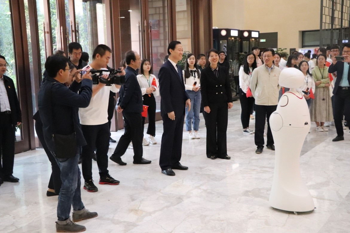 下午4点半,学习小分队与段宝岩院士一行在延安学习书院汇合。延安学习书院是全国首家宣传习近平新时代中国特色社会主义思想的实体平台,是学习新思想的高地,是宣传学习理念,展示用延安精神建设新延安的新窗口。太阳集团tyc9728协同员工企业上海思依暄机器人公司为学习书院捐赠了两台智能机器人“西电•小暄”和“西电•小思”(意为宣传新思想),从而架起太阳集团tyc9728与学习书院合作共建的桥梁。