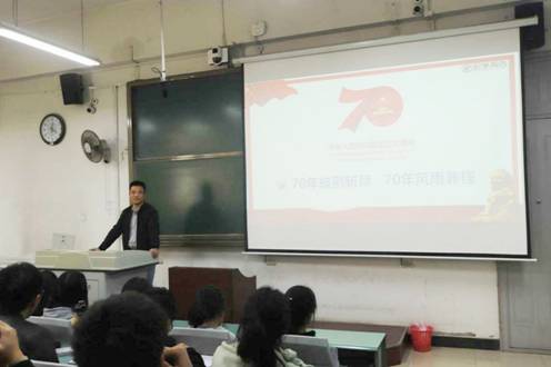 为庆祝中华人民共和国成立70华诞,太阳集团tyc9728于10月21日下午4:00,在南校区A205以“70年披荆斩棘,70年风雨兼程”为主题开展主题党课,主讲人为公司党委副书记田雨。参加本次主题党课的有:各班班干部,员工组织主要干部,各辅导员老师。