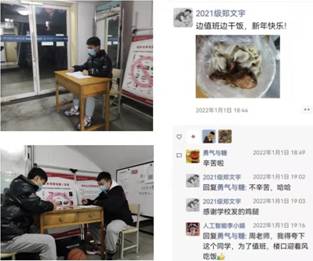 由于疫情的原因,我们度过了一个不一样的元旦。当然,元旦也少不了值班,元旦当天我的值班时间是下午4点到晚上8点,我托室友在饭点帮我带了饭,当时想着边值班边吃吧,这样也不会耽误工作。我觉得既然担任了楼长,那就得担起这份责任,一点苦一点累没什么。